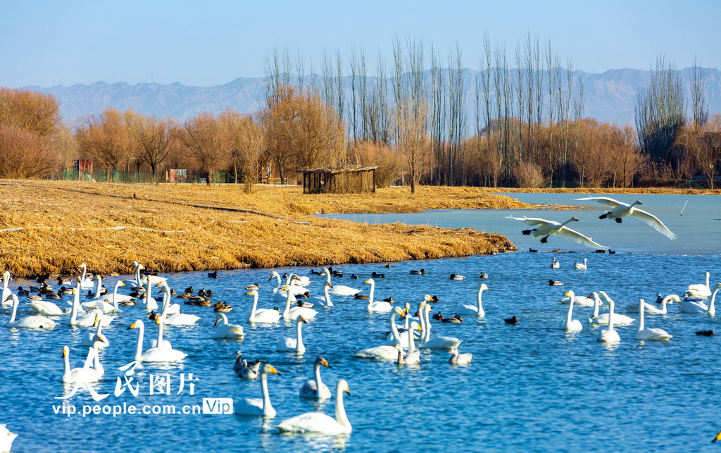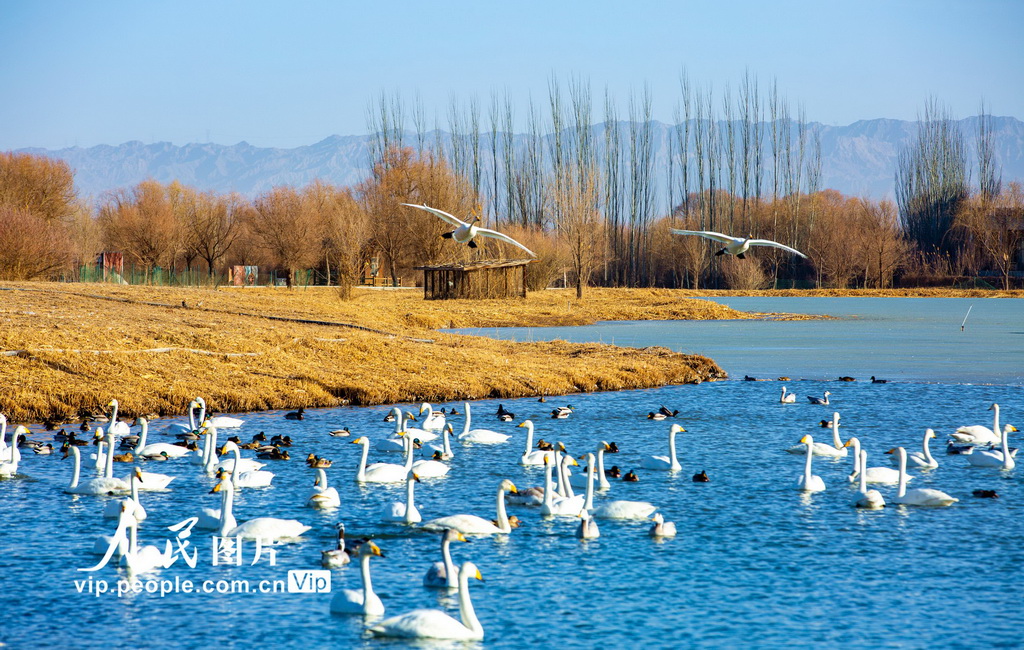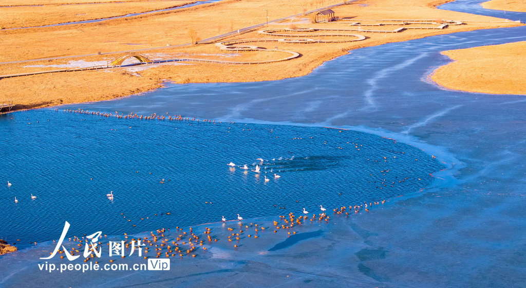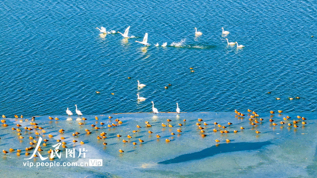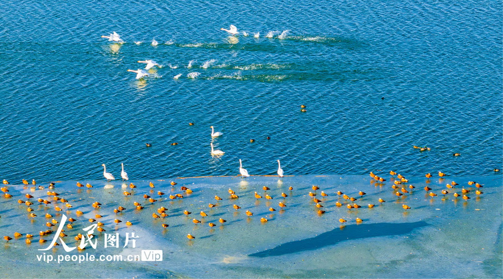 幸运彩app成群的大天鹅、赤麻鸭等候鸟在湖水中游弋、觅食。杨永伟摄(东说念主民图片网)" />